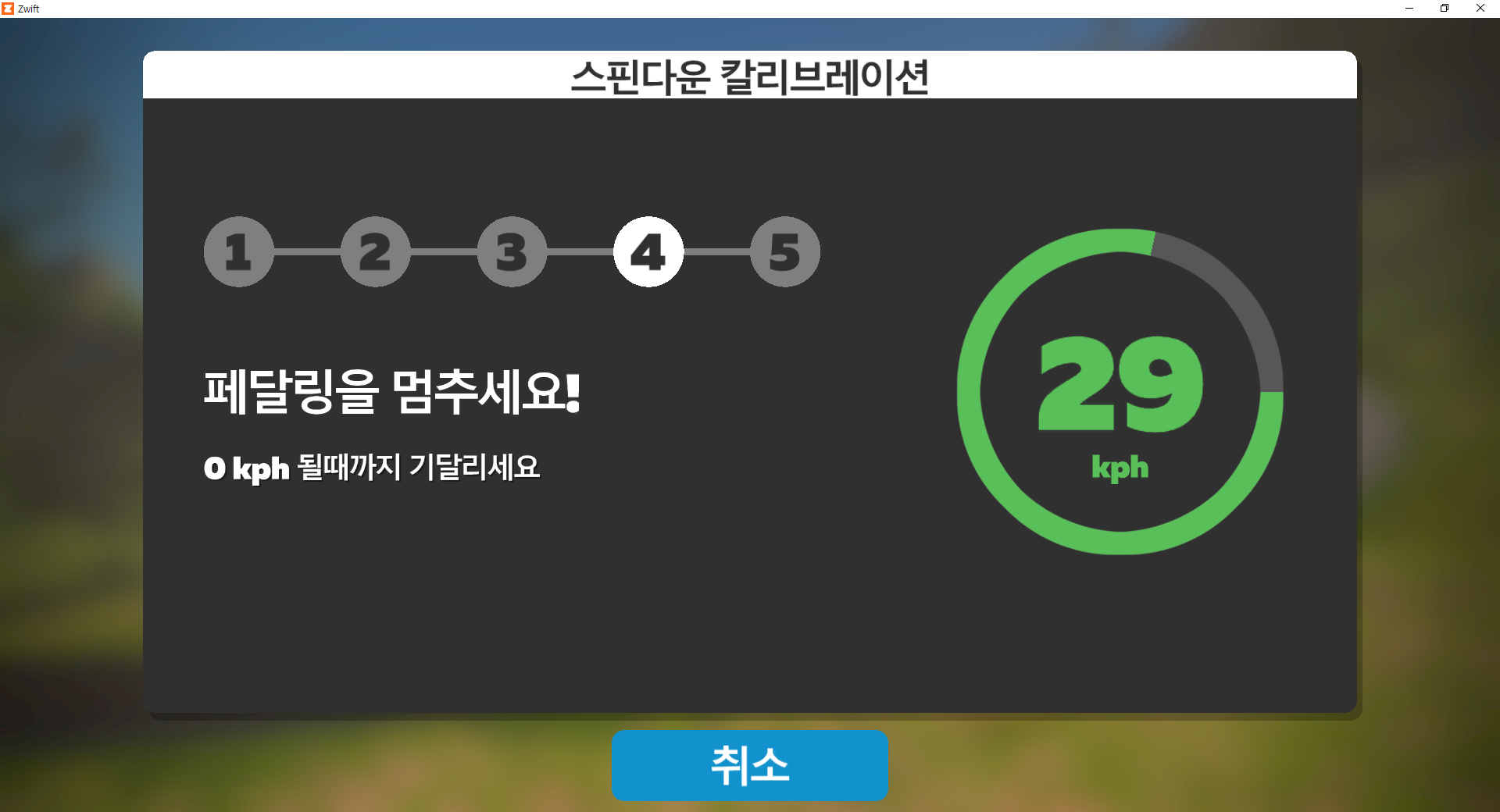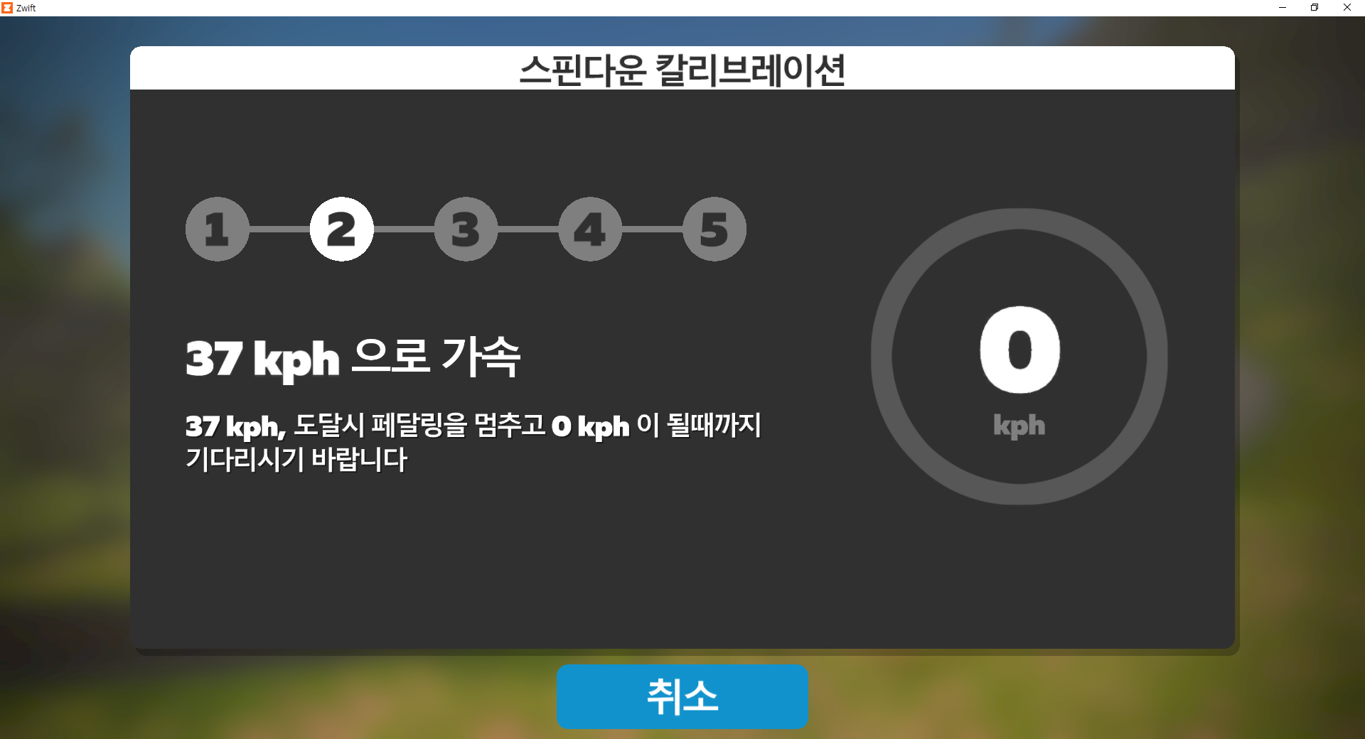 상단 이미지와 같은 화면이 나타나게되면, 자전거를 타고 페달링을 합니다. 점점 속도가 올라 37kph가 되면 페달링을 멈추시면 됩니다.