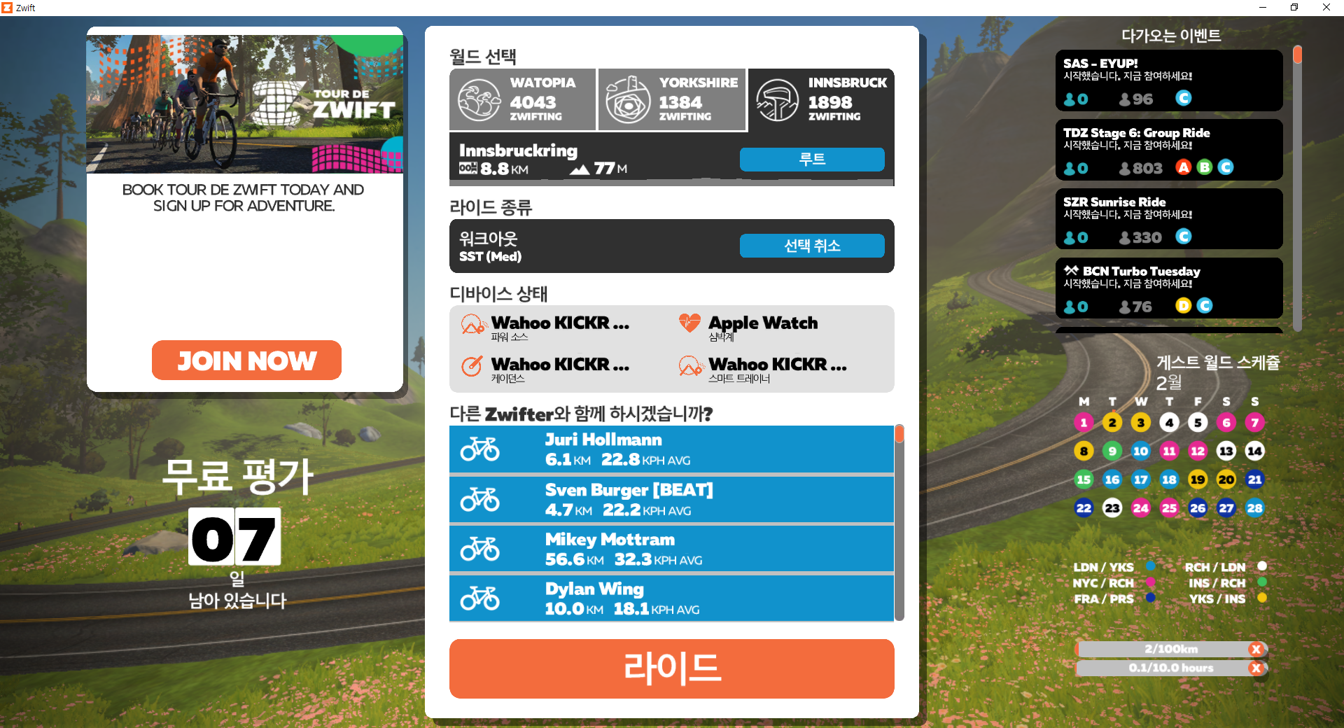 iOS App 중 zwift Companion App에 로그인을 하게 되면 볼 수 있는 화면 입니다.