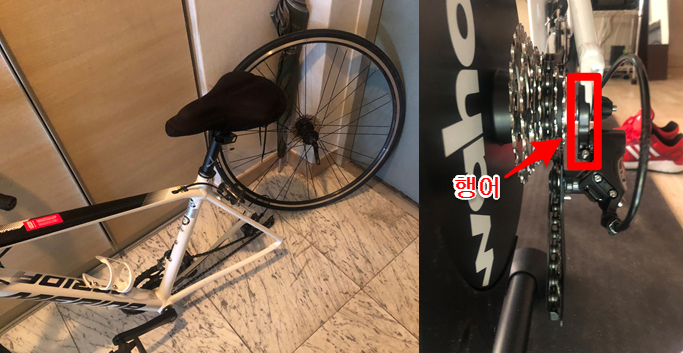 이렇게 자전거 페달링 문제로 시간 허비를 제일 많이 했는데, 자전거 분리&결합에 익숙하지 않으신 분들은 체인이 스프라켓에 결합될 때, 상하 부분이 제 위치에 제대로 꼽혀있는지 확인 후 QR레버를 잠궈야합니다. 이때, 안장을 살짝 누른 후 자전거와 와후키커가 제대로 붙도록 하여 QR레버를 돌려라고 하는 글들이 많이 있었습니다.