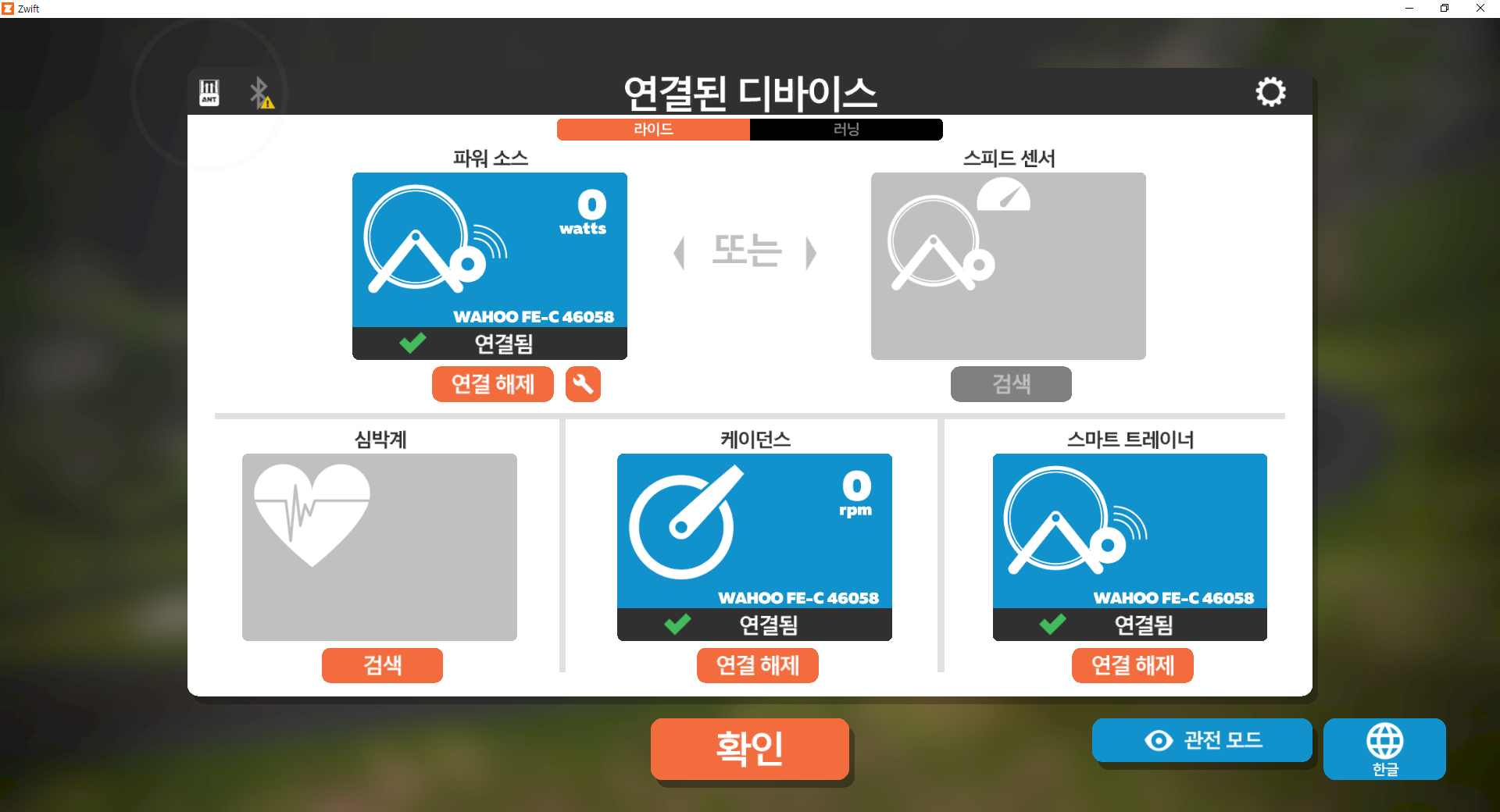 라이딩을 할때, 상단과 같이 디바이스 연결하는 부분이 있습니다. 이는 PC/모바일에서의 화면은 동일하게 나타납니다. 모바일은 내부에 블루투스 기능이 있어 상관없지만 PC에서는 싱크라이더 ANT 가 필요합니다. 때문에 와후키커 주문시 추가 주문을 하였습니다. PC에서 작동하는 것이 편하다보니 구매를 해두었지만, 사실 패드가 있으신 분은 싱크라이더까지 안사도 되지 않을까 합니다. (물론, 상황에 따라 구매/비구매 선택을!!)