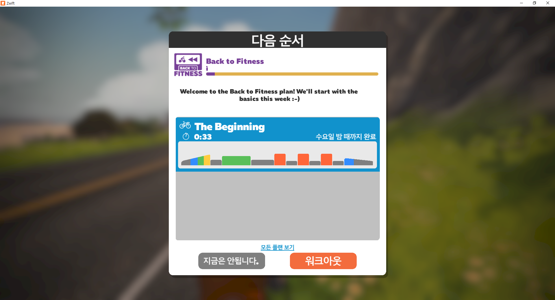이러한 과정을 거친 후, 즈위프트에서 확인을 누르고, 아래와 같이 운동 플랜을 선택하시면 바로 라이딩이 가능합니다.