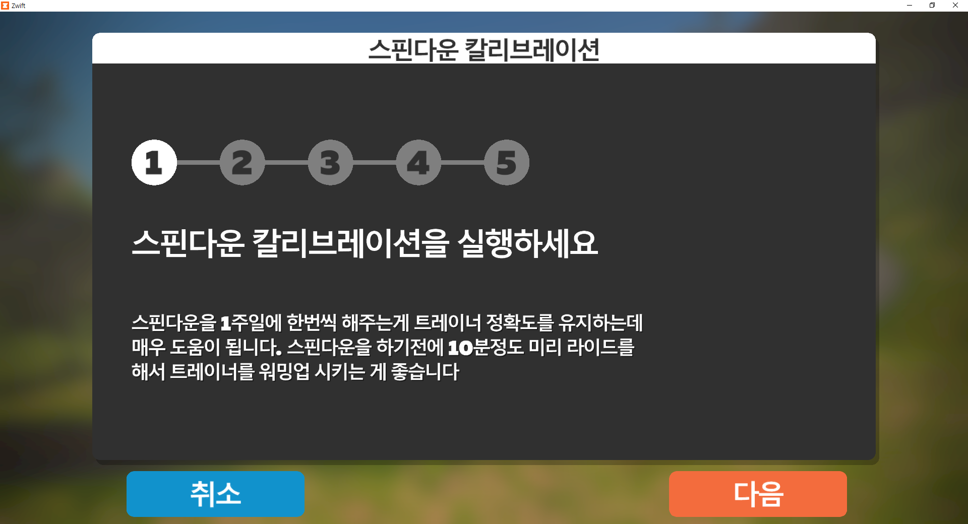 와후키커의 보정률이 1%(+,-)라고 하던데, 그래도 쯔위프트 앱을 실행 후 캘리브레이션을 하는 것이 좋다고 이야기를 들었습니다. 캘리브레이션의 경우 파워소스 연결 후 설정옵션이 보이게 되는데 이를 선택하게 되면 다음과 같은 화면이 나타나게 됩니다.