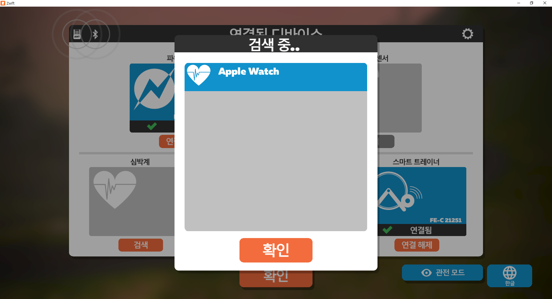 zwift companion App에 의해서 PC에서도 애플워치연동이 뜹니다.