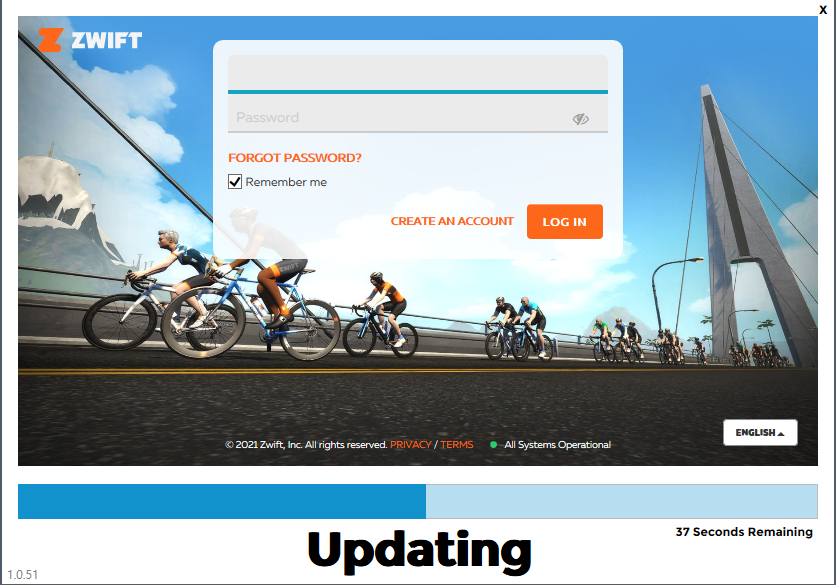 즈위프트를 실행하면 상단이미지와 같이 로그인을 하도록 되어있습니다. 로그인을 하는 과정 중 업데이트를 진행하고 있구요. 5분 내외로 실행되니 화장실 정도 다녀오시면 되지 않을까 하네요.