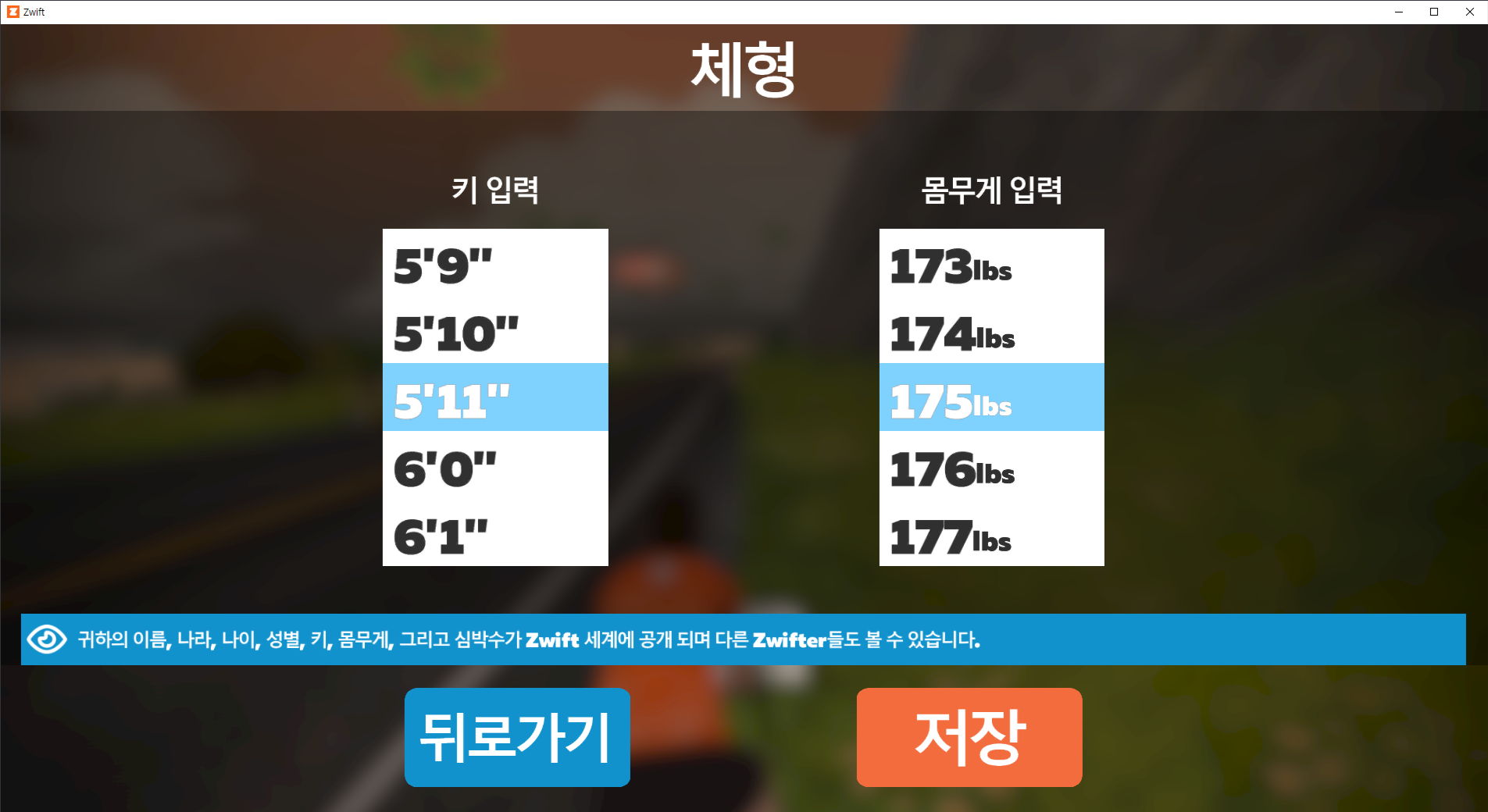 zwift 사용법 : 사용자 정보 입력(키/몸무게/타이어)