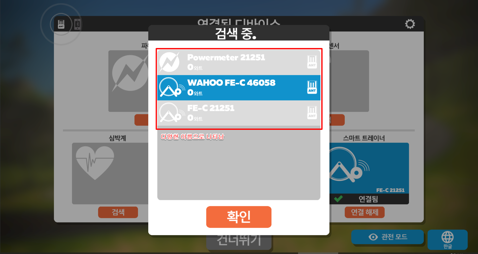 라이딩을 할때, 상단과 같이 디바이스 연결하는 부분이 있습니다. 이는 PC/모바일에서의 화면은 동일하게 나타납니다. 모바일은 내부에 블루투스 기능이 있어 상관없지만 PC에서는 싱크라이더 ANT 가 필요합니다. 때문에 와후키커 주문시 추가 주문을 하였습니다. PC에서 작동하는 것이 편하다보니 구매를 해두었지만, 사실 패드가 있으신 분은 싱크라이더까지 안사도 되지 않을까 합니다. (물론, 상황에 따라 구매/비구매 선택을!!)