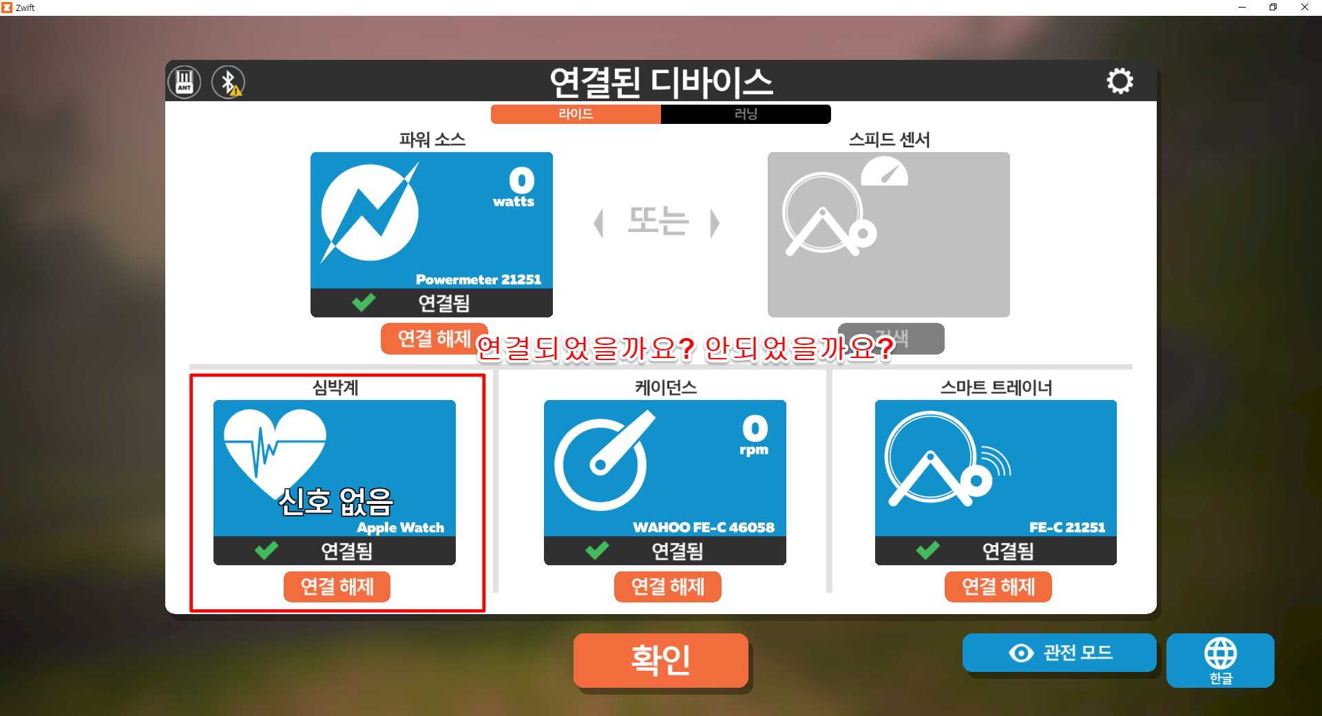 애플 워치가 제대로 연동되면 상단 이미지와 같이 심박 수치가 나타나게 됩니다. (스마트 트레이너 연결이 다른걸로 되어있네요 ㅜㅜ)