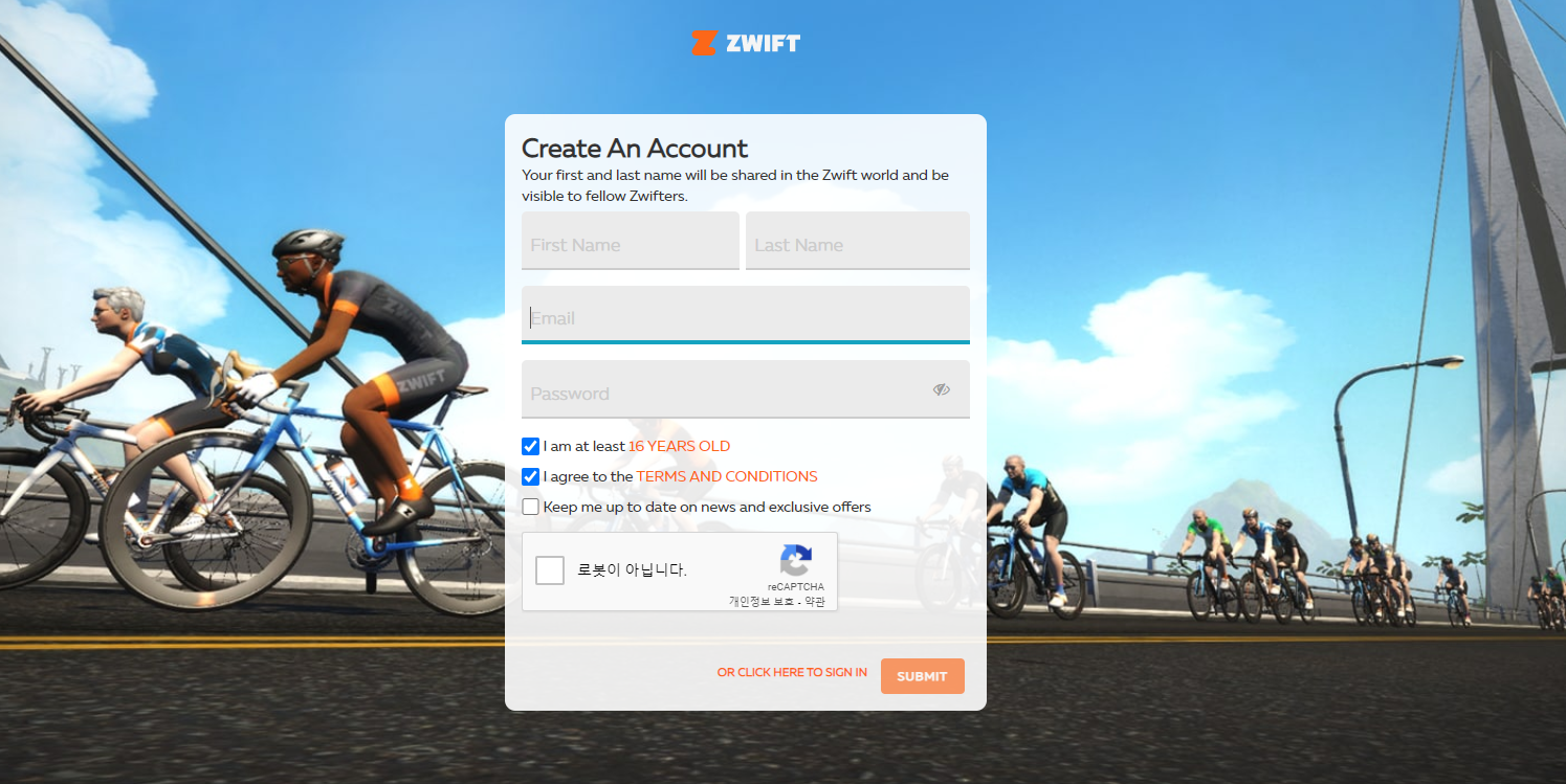 즈위프트(zwift) 홈페이지에 접속하여 회원가입을 하면 됩니다. 간단하게 메일주소와 비밀번호를 입력하시면 됩니다. 이후, 필요한 정보들은 App을 실행하고난 이후 입력되기 때문에 가입시 절차는 엄청(?)간단하게 진행됩니다.