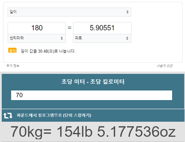관전이 끝나고, 이것저것 누르다보니 사용자 정보(키/몸무게)를 입력하는 부분이 있었습니다. 변환 툴은 네이버에서도 본것 같지만, 구글에 검색을 하셔도 나오니 검색해보셔도 됩니다. 아래는 필요에 따라 링크를 사용하셔도 됩니다.