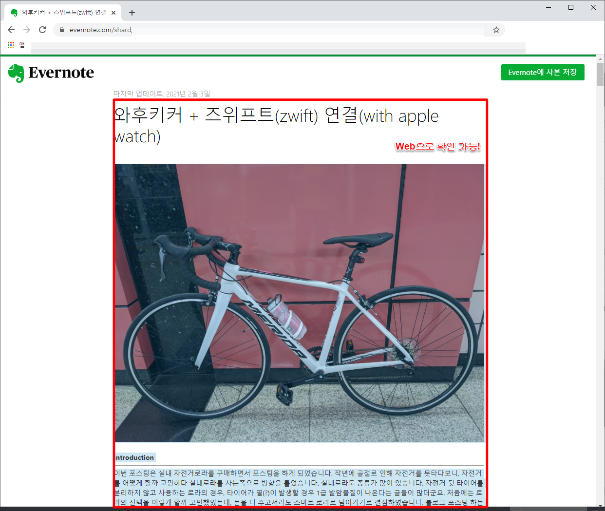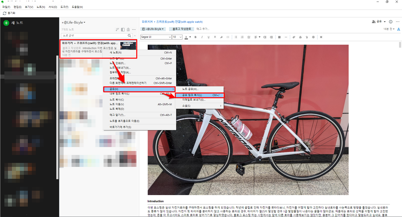 에버노트에서 작성이 완료된 포스트에 한해 상단 이미지와 같이 "공유 링크 복사(L)"을 선택합니다. 그리고 웹 브라우저를 이용하여 붙여넣기 실시합니다.
