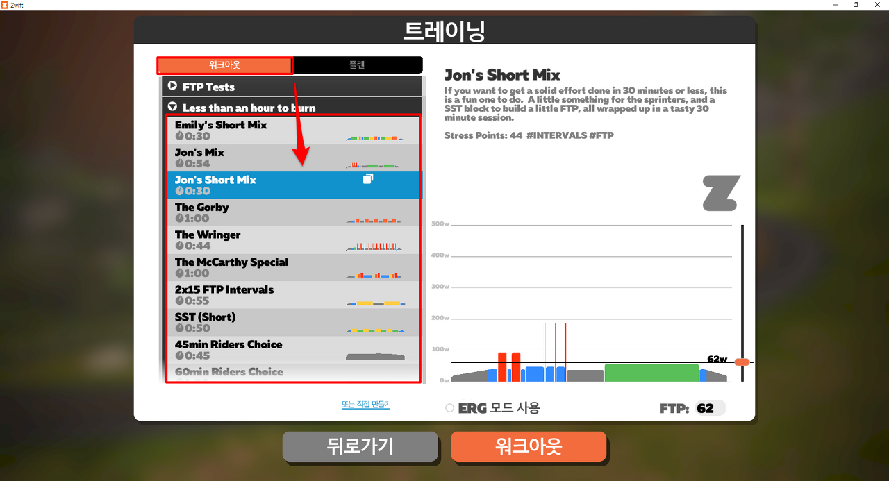 즈위프트에서 기본적으로 다양하게 구성되어 있는 라이딩 훈련 매뉴얼 선택 가능