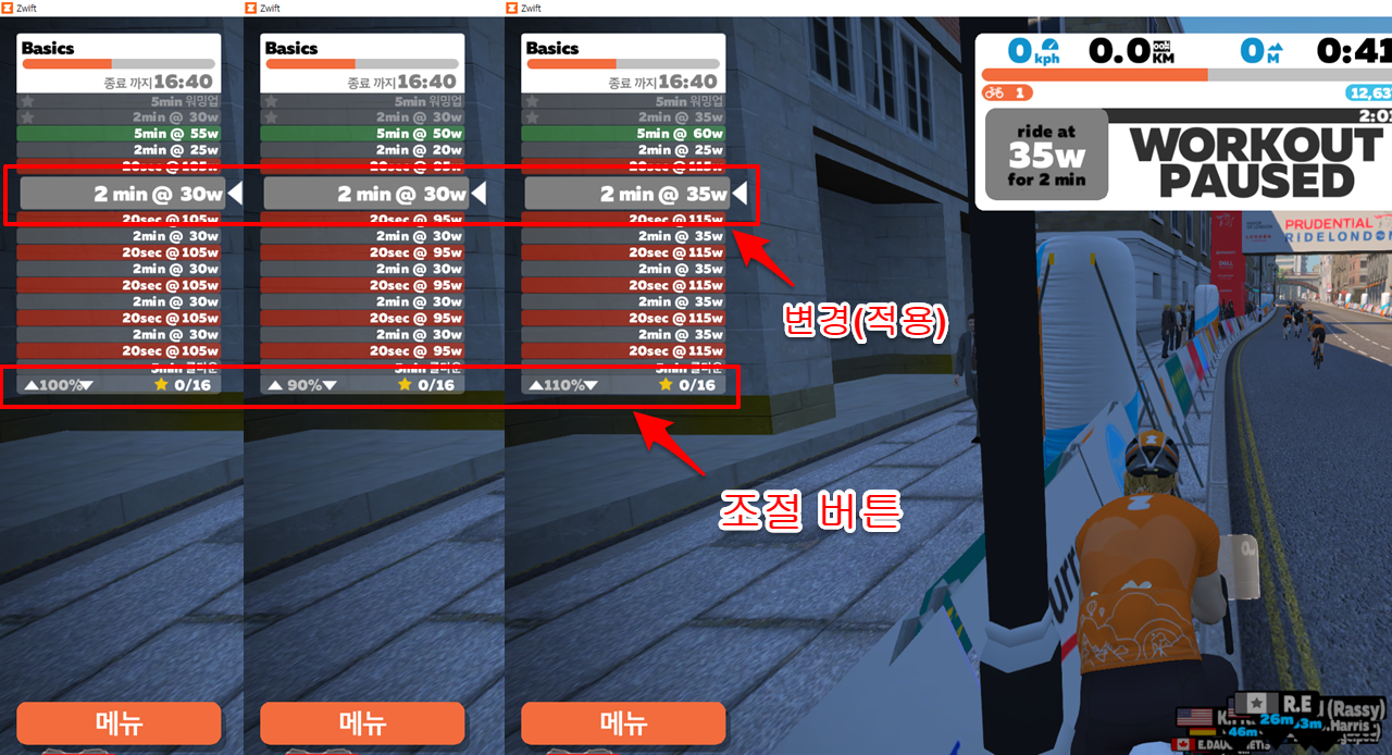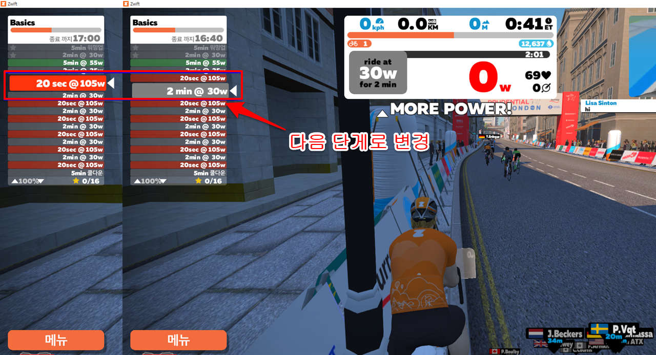 화면을 보면 각각의 플랜에 대해 세부적인 훈련내용들이 나타나게 됩니다. 상단 이미지에서 각각의 블럭에 마우스를 이동하게 되면 각각의 구간에 대한 와트(W)가 표시 됩니다. 현재 사용하고 있는 스마트로라에서 자동으로 저항을 조절해주지 않을까? 하네요, (어떻게 구동되는지는...)