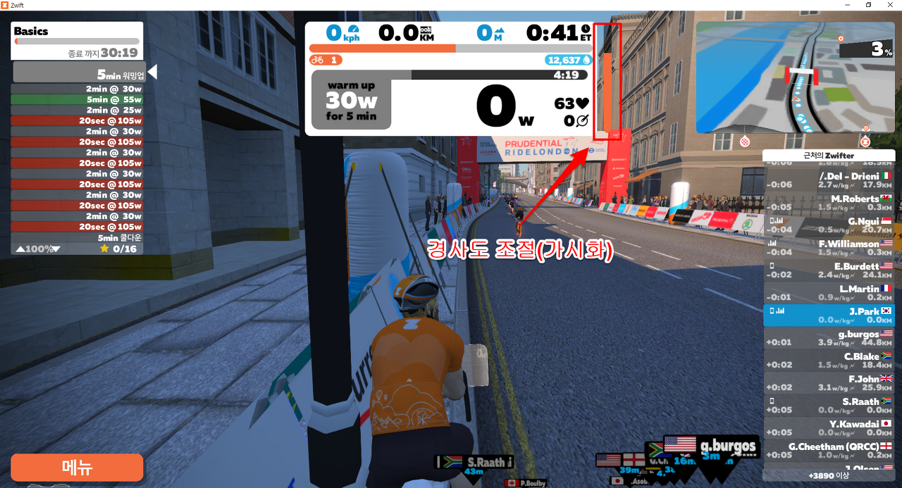 실내 라이딩을 하면서 페달링이 너무 가볍다라고 생각되면 경사도 조절을 이용하여 변경이 가능합니다. 모바일/패드에서는 조절이 가능한데, PC에서는 조절이 안되네요. (단순히 인터페이스 변경된 부분만 가시화 되고 있습니다. )