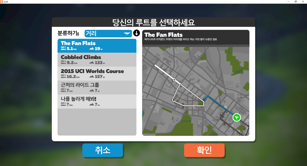 가상공간(월드) 및 라이딩 루트를 선택하는 부분에 있어서 중요한 것은 이동거리와 고도라고 생각 됩니다. 선택할 수 있는 인터페이스로 이동하게되면 자동으로 정렬이 가능 합니다. 그리고 라이더의 상황에 따라 적절한 루트를 선택 하면 됩니다.