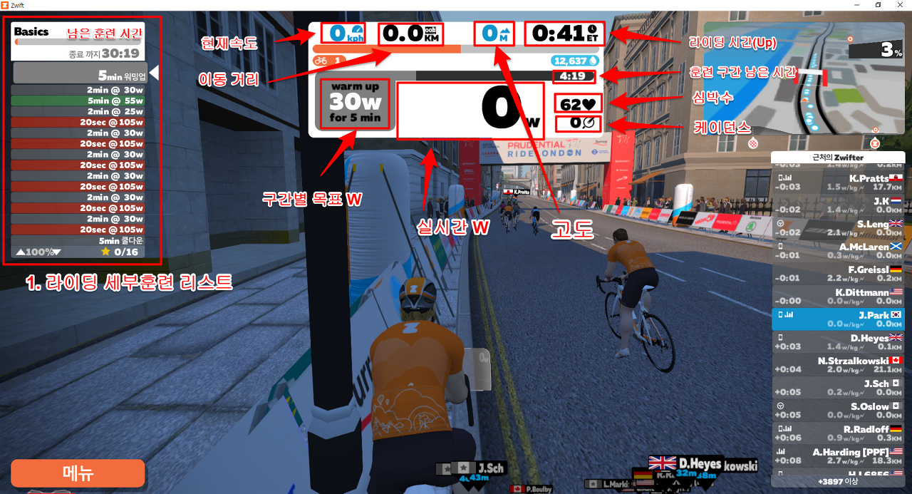 이번 포스팅은 즈위프트(zwift)의 실행화면에 대해 알아보고자 합니다. 블로그들을 찾아보면 지난 인터페이스로 인해 혼돈이 되더라구요. 그래서 메뉴를 확인차 겸사겸사 스크린샷을 찍어두었습니다. 그리고 각각의 메뉴를 잘 알아야 라이딩 할 때, 당혹스러운 상황들이 없어지겠죠? 당연히 실내/실외 둘다 마찬가지로 정보가 우선인 것 같습니다. 첫 소개글은 여기가지 쓰고, 바로 넘어가도록 하겠습니다.