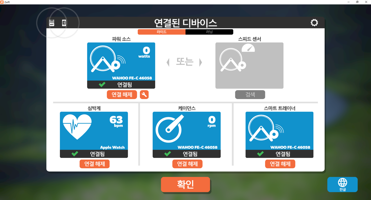 즈위프트를 실행하면 상단 이미지와 같이 나타나게 됩니다. 이전 포스팅에서 즈위프트 설치 및 연결 관련 포스팅을 해두었기에 필요하신 분들은 참조 하시기 바랍니다.