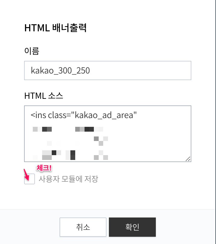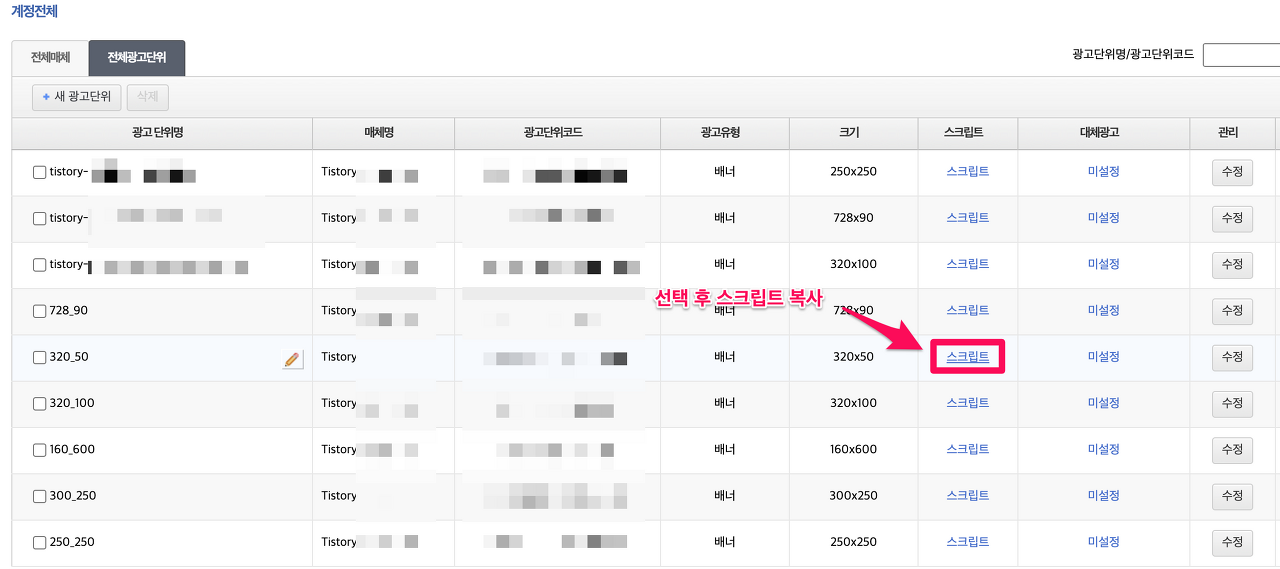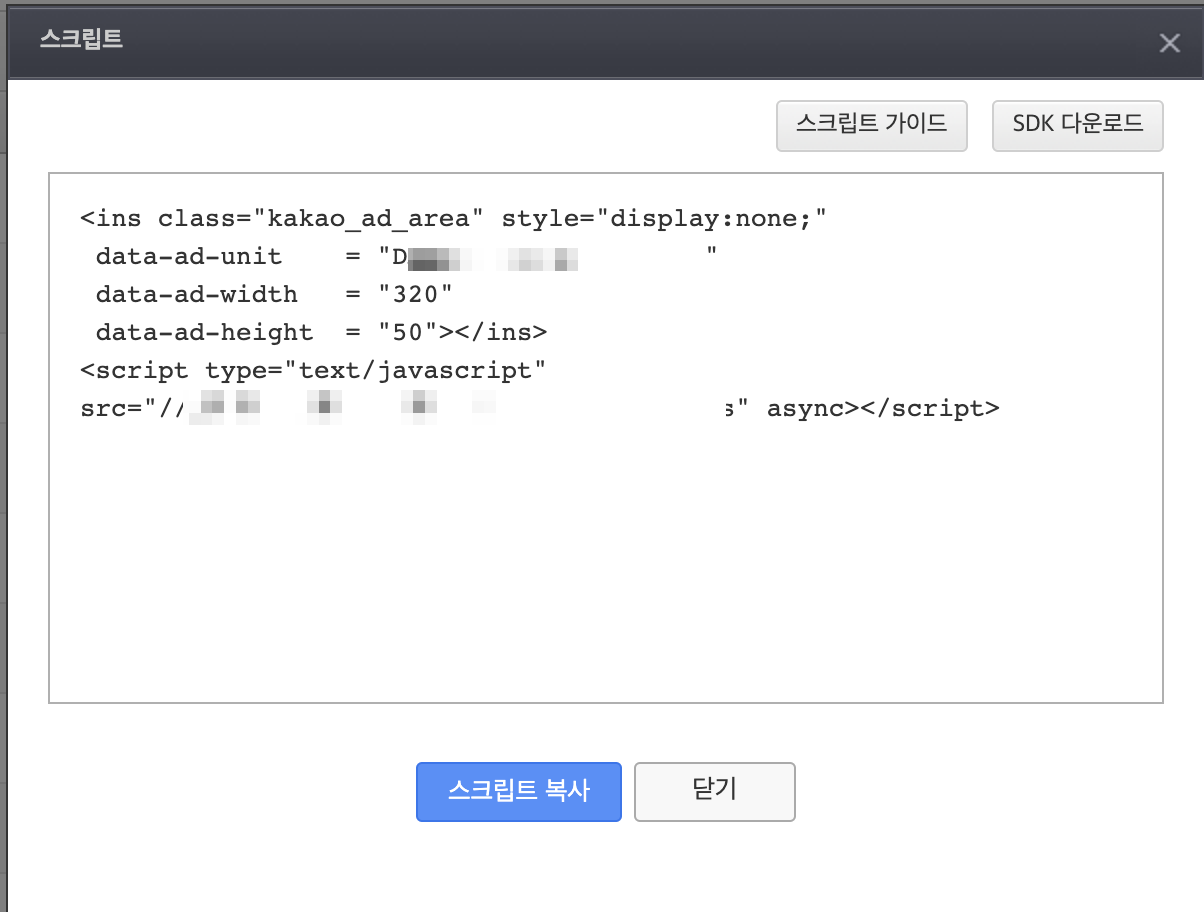 kakaoAdfit 스크립트 복사 후 붙여넣기(저장)