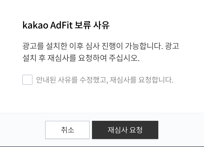 그리고 kakao Adfit 에서 1차 티스토리 주소를 작성하고 심사요청을 수행하니 아래와 같은 메시지가 발생하였습니다.