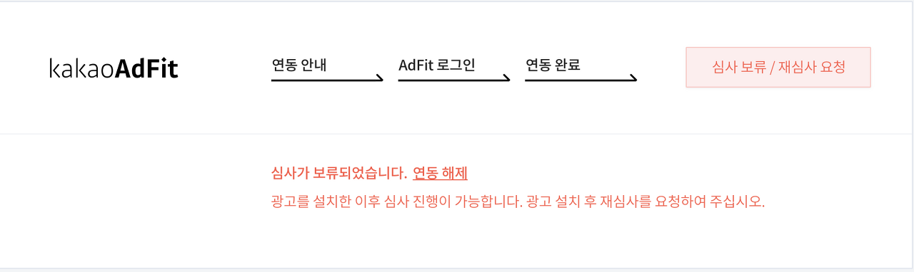kakaoAdfit 2차 도메인 연결 완료 후, 1차 티스토리 주소가 그대로 남아있던 상황에서 상단 이미지와 같은 오류가 발생하였습니다. 이에 대해 카카오 문의메일로 물어보니 재심사가 가능하도록 변경해주셨고, 1~2일 이내에 처리가 완료 되었습니다.