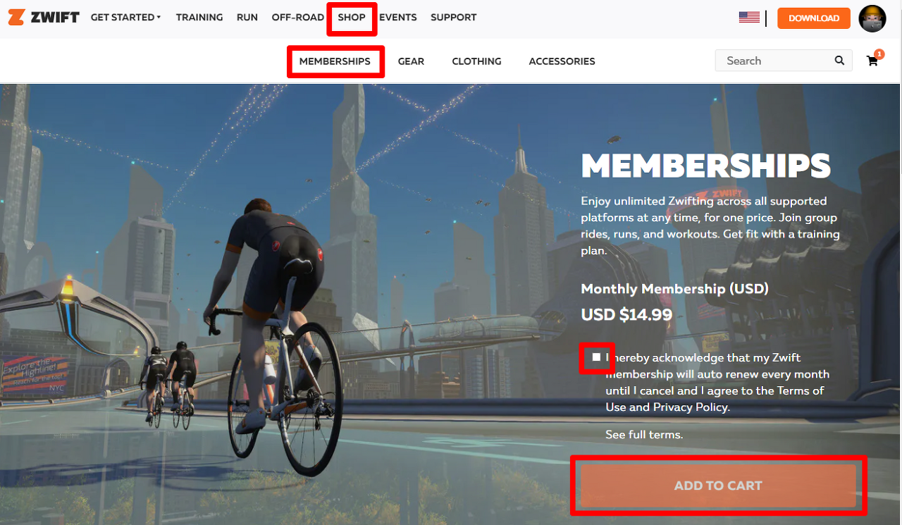즈위프트 홈페이지에서 Shop> Memberships 를 눌러 이동을 하면 상단 이미지와 같이 나타납니다. 이때, 매달 결제를 하기 위해 체크박스 동의 후 장바구니에 넣어둡니다. 장바구니에 담고, 우측 상단에 카트(아이콘)을 선택하게 되면 다음 이미지와 같이 나타납니다.