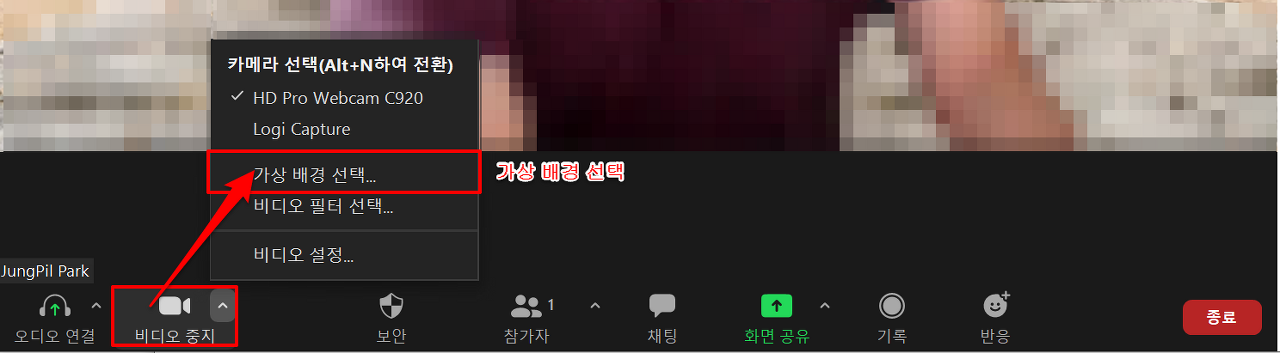 줌 배경화면을 변경하기 위해 Zoom 화상 회의 화면에서 다음과 같은 순서대로 메뉴를 선택합니다. 선택하게 되면 아래와 같은 화면이 나타나게 됩니다.