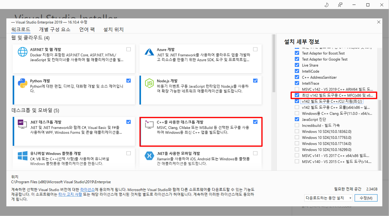 - C++를 사용한 데스크톱 개발 > 최신 v142 빌드 도구용 C++ MFC 선택