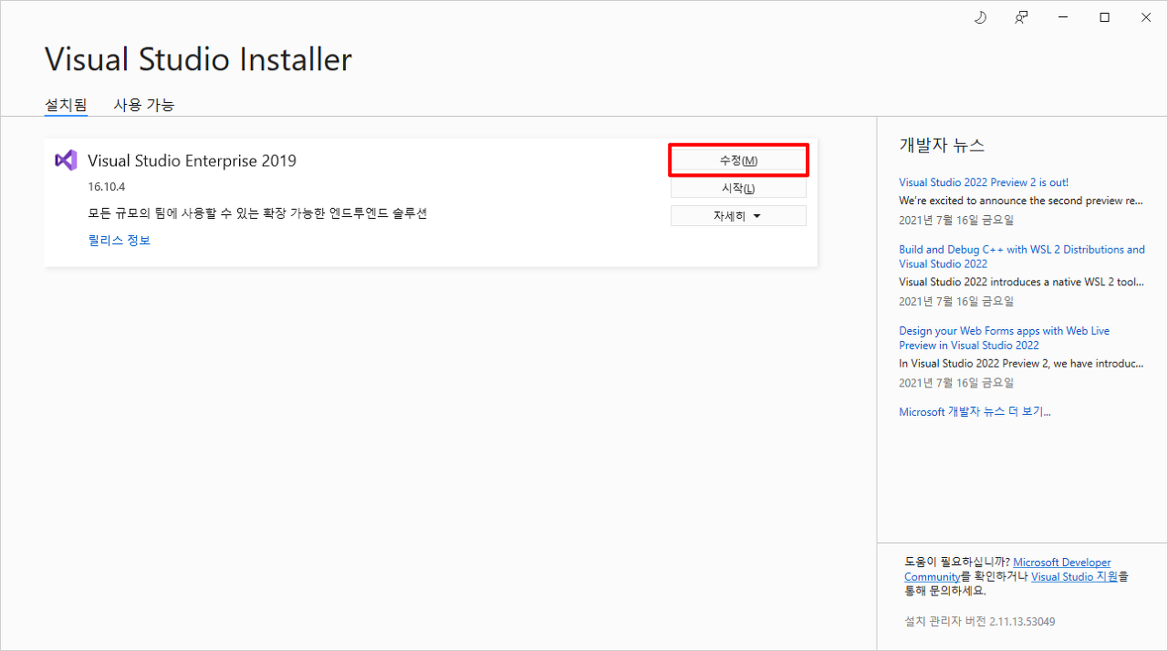 서두에 조금 불필요한 말을 썼지만, Visual Studio 2019 에는 MFC가 기본적으로 포함되어있지 않기때문에 아래와 같이 추가 하시면 됩니다.
