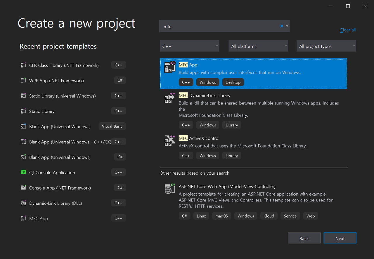 설치가 진행되고, Visual Studio를 실행하게 되면 다음과 같이 MFC 프로젝트를 생성할 수 있습니다.