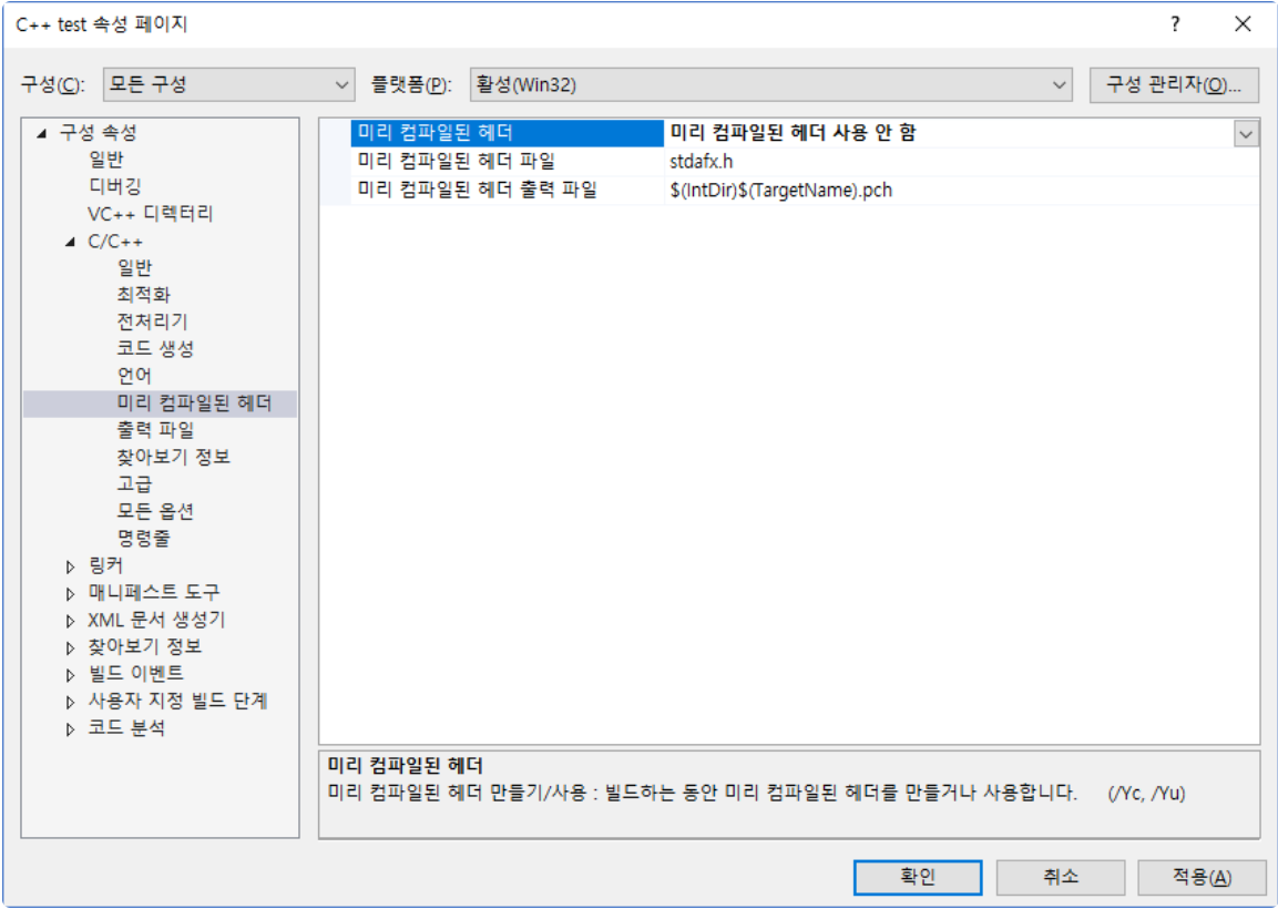 구성 속성 > C/C++ > 미리컴파일된 헤더 > 미리 컴파일된 헤더