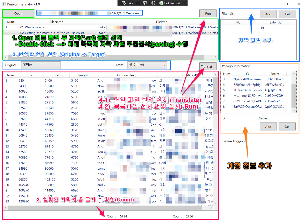 - 현재 자막 파일은 (*.srt) 파일만 구문분석(Parsing) 가능합니다. 이로 인해, 등록된 자막 리스트를 추가/수정하여도 번역되지 않습니다.