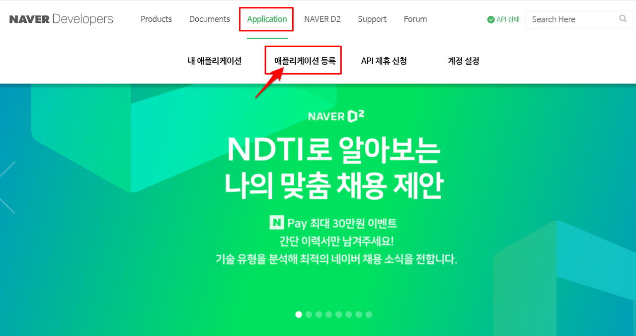 네이버 개발자 홈페이지에 접속 후, 개발자 등록(?)을 실시 합니다. 테스트 하기 전 캡쳐하지 않아 이미지는 없습니다. 절차는 간단하니, 확인 후 넘어와 주시기 바랍니다. 이어서 애플리케이션 등록 페이지를 선택합니다.