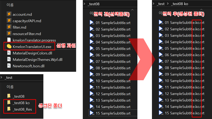- 결과는 Target 언어인 한국어(Ko)에 맞춰 (파일 이름을 다르게 표기하면 또 수정해야하니...) 폴더 생성 후, 번역된 자막파일이 저장됩니다.