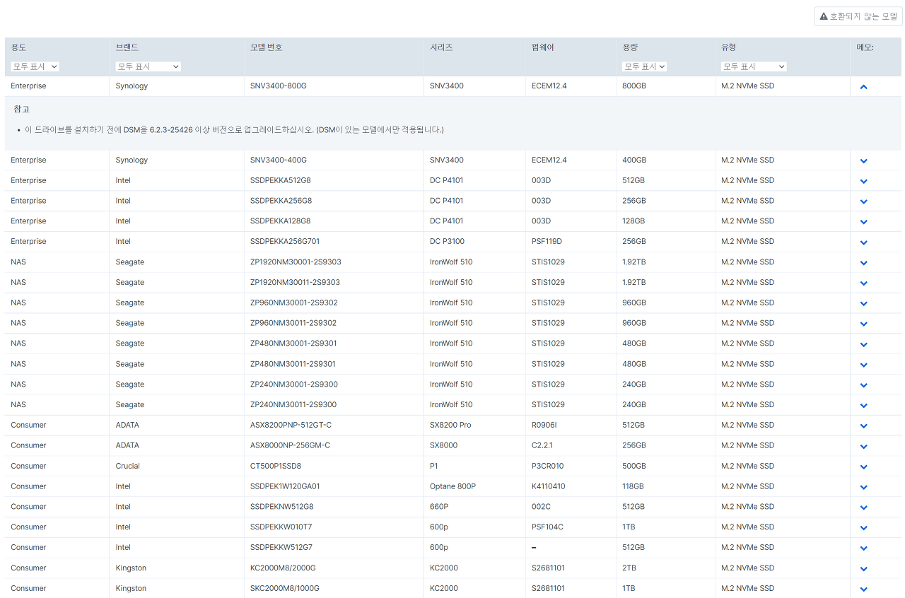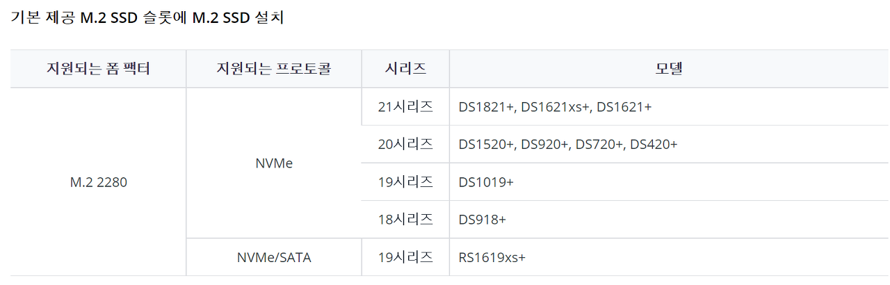 Synology Nas모델에 따른 SSD 캐쉬의 폼펙터는 어떤 것들이 있는지는 SSD 캐쉬- 폼 펙터 링크에서 확인 가능