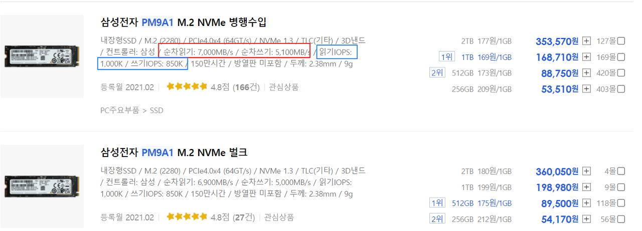 참고로, SSD 용량에 따라 SSD의 속도도 다르기때문에 꼭 제품을 비교하여 구매하시기 바랍니다.