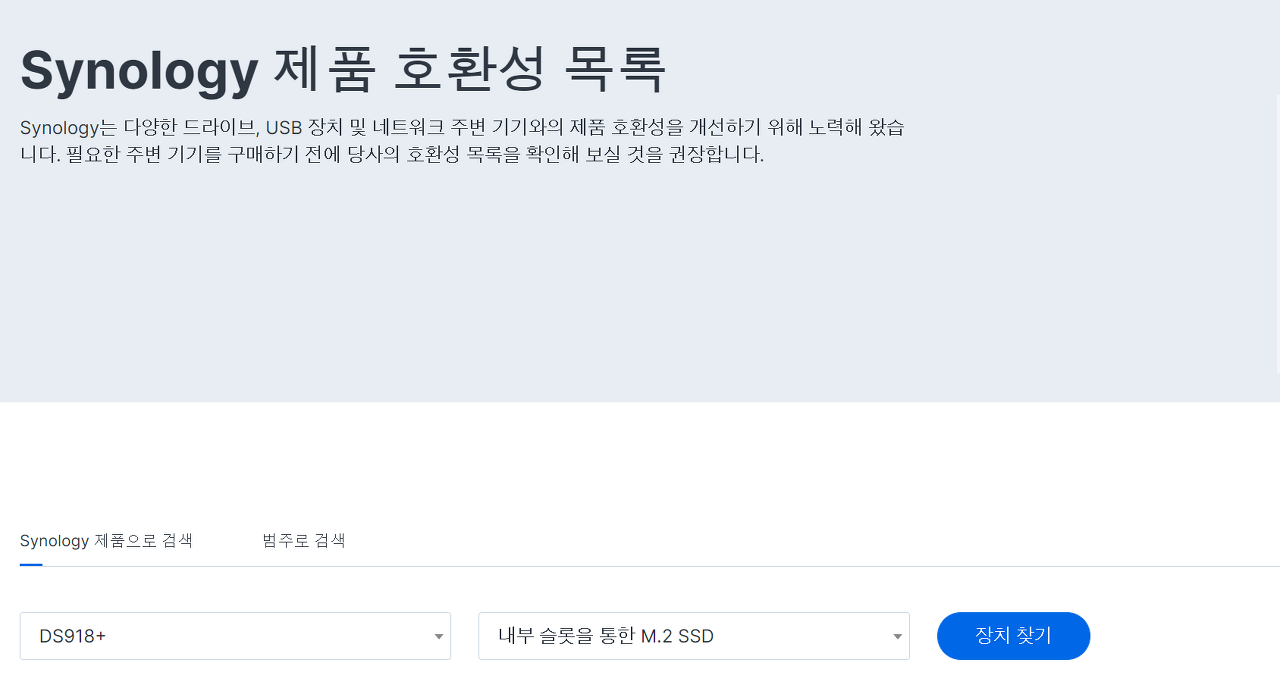 보유하고 있는 시놀로지 모델(DS918+)를 선택하고, "내부 슬롯을 통한 M.2 SSD" 선택 및 장치 찾기를 선택하면 아래와 같은 페이지가 나타나게 됩니다.