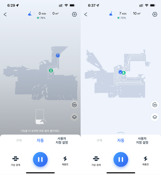 그렇게 청소가 끝이나면 모바일에는 상단과 같이 나타나게 됩니다. 출입구(?)를 좁아지는 것으로 파악하는 것 같은데, 이렇게 방3개로 분류하여 나타나게 됩니다.