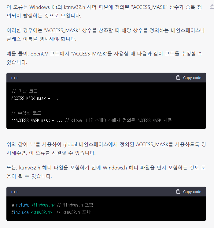 참고 : C/C++ 기반 openCV와 Windows Library 내부 ACCESS_MASK 상수가 충돌이 발생하여 나타나는 오류입니다.